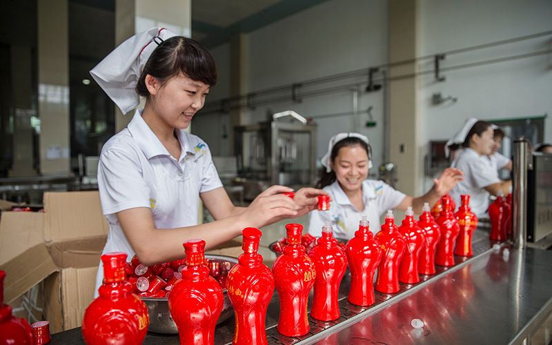 進(jìn)入包裝車間首先看到的是上瓶臺(tái),酒瓶進(jìn)入機(jī)器當(dāng)中會(huì)有自動(dòng)夾子夾起酒瓶倒立過來,內(nèi)有強(qiáng)力水柱來對(duì)瓶子內(nèi)外部進(jìn)行沖洗,沖洗干凈的酒瓶通過傳送帶輸送到控瓶機(jī),接下來控瓶機(jī)在這里會(huì)對(duì)酒瓶進(jìn)行控干——之后經(jīng)過燈檢處來檢測(cè)酒瓶內(nèi)外有沒有洗干凈,瓶身有沒有裂痕,自動(dòng)定量灌裝機(jī)也叫智能感應(yīng)灌裝機(jī),內(nèi)有24個(gè)灌裝口同時(shí)灌裝—灌裝之后緊接著就是燈檢,檢測(cè)瓶中酒的容量,同時(shí)檢測(cè)酒瓶中有沒有雜質(zhì)。走到這邊看到的這臺(tái)機(jī)器叫做自動(dòng)壓蓋機(jī),瓶蓋經(jīng)過機(jī)器會(huì)有高壓氣槍先吹干凈,然后再壓蓋上去。壓蓋機(jī)器分為自動(dòng)封蓋機(jī),根據(jù)瓶蓋的不同來使用——接下來是烘干,這次烘干主要是針對(duì)瓶身,為了方便貼標(biāo)簽——再一次進(jìn)行燈檢,這次與前兩次就有一點(diǎn)的不同了,我們可以看到,女工會(huì)把每瓶酒都晃動(dòng)一下,搖晃瓶身的目的是要檢查瓶蓋是否蓋好,有沒有漏酒現(xiàn)象,同時(shí)再一次的檢測(cè)酒當(dāng)中有沒有雜質(zhì)——經(jīng)過層層檢測(cè),確定合格的產(chǎn)品會(huì)經(jīng)過這臺(tái)激光噴碼機(jī)來自動(dòng)噴碼。